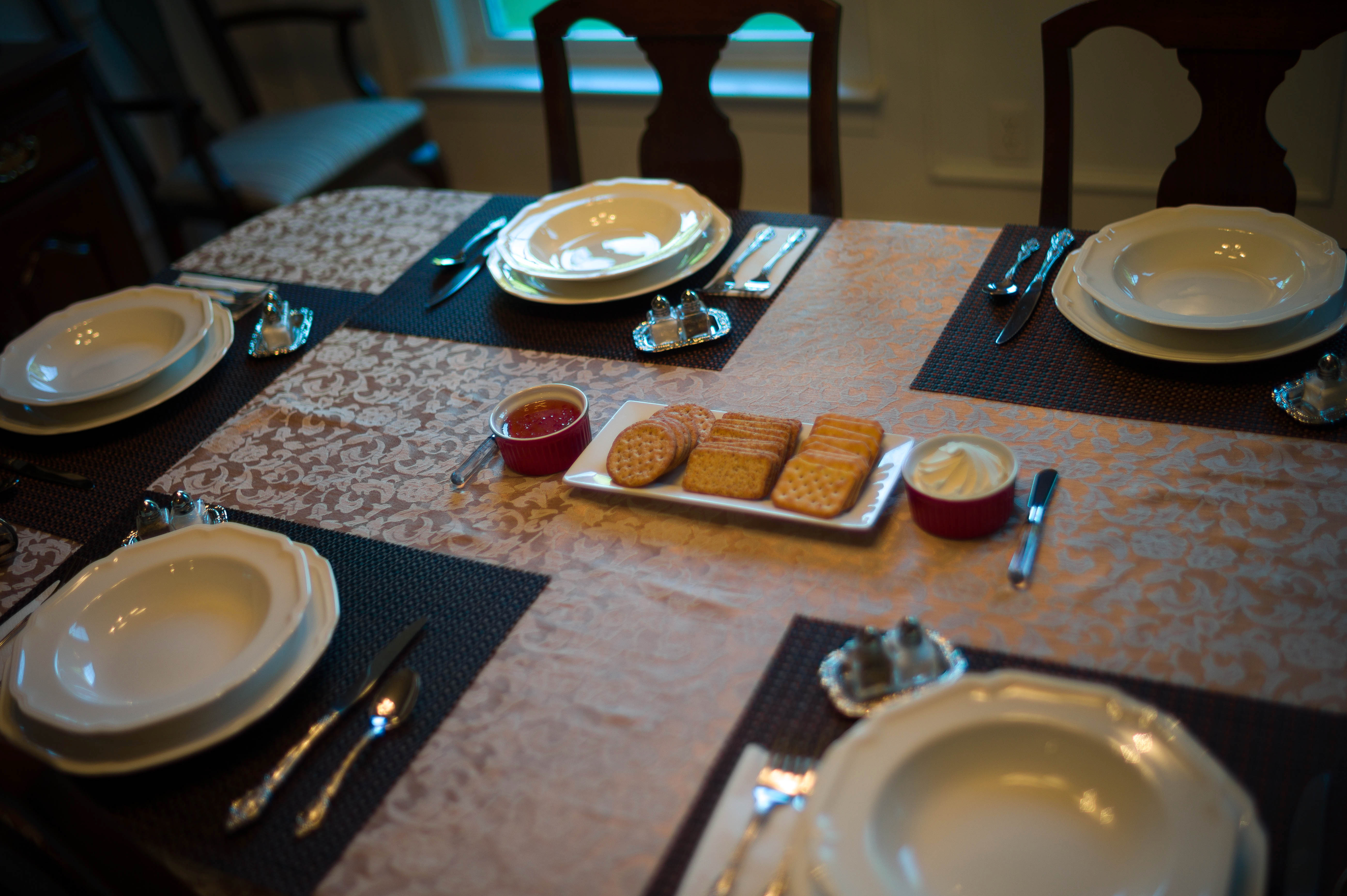 A beautifully set dining table showcases an inviting arrangement of fine china and polished silverware, exuding warmth and hospitality. The soft, natural light streaming through the window casts a gentle glow on the beige tablecloth, enhancing the mood of comfort and anticipation. In the center, a colorful assortment of cookies and dips beckons, suggesting a delightful gathering is about to unfold.