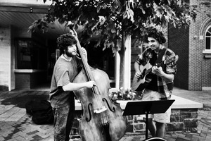In this black-and-white photograph, two young musicians share a moment of joyful collaboration, showcasing the spontaneity of street performance. The contrasting expressions of concentration and delight capture a lively, carefree atmosphere, while dappled shadows from a nearby tree create a play of light and texture. The composition invites the viewer into their vibrant world, blending music and camaraderie in an urban setting.