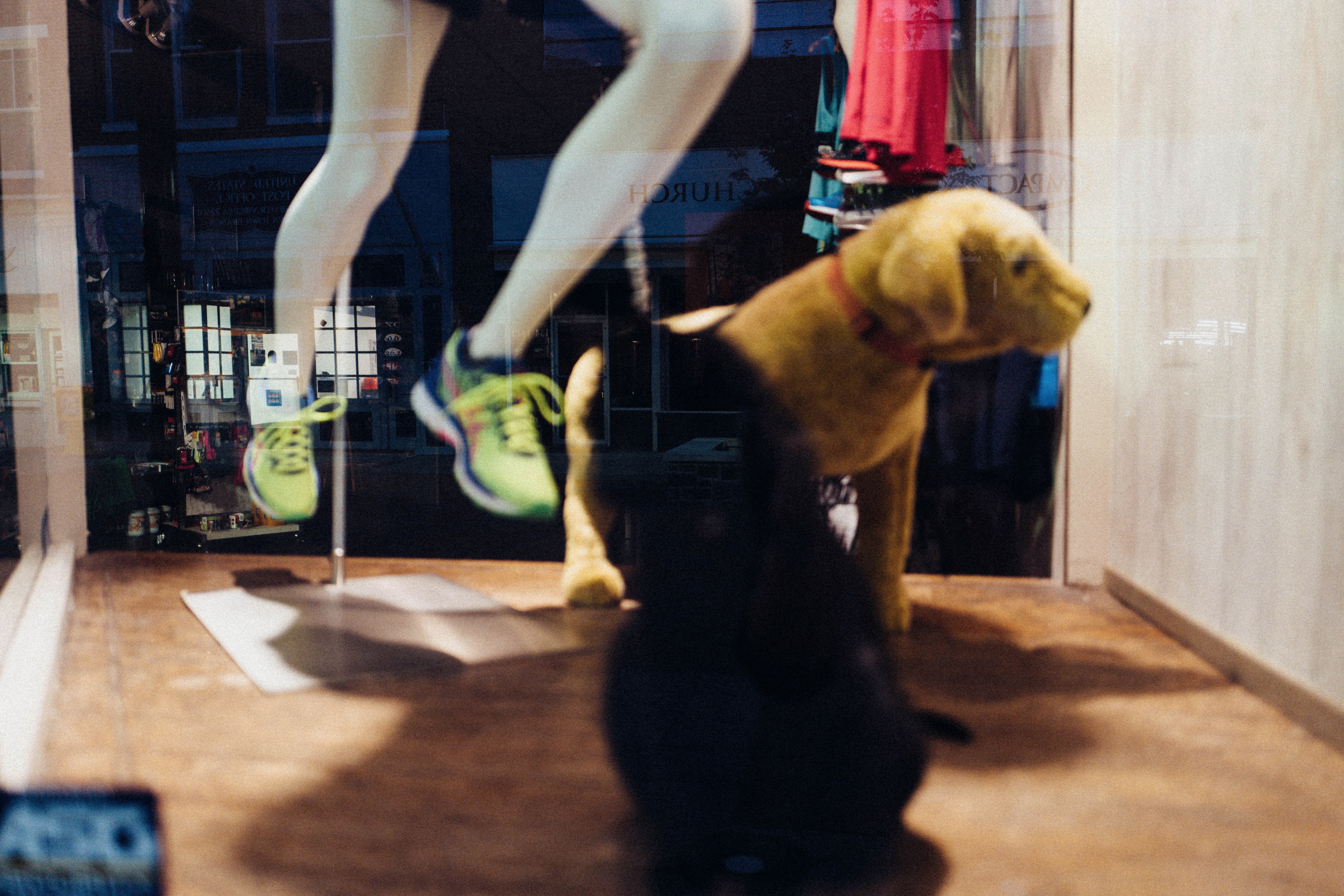 A vibrant storefront window features a mannequin in motion, wearing bright athletic shoes, capturing a sense of energy and activity. Beside it, a playful golden retriever statue adds a whimsical touch, contrasting with the sleekness of the activewear. The lighting reflects a warm yet urban mood, inviting viewers to engage with the lively scene.