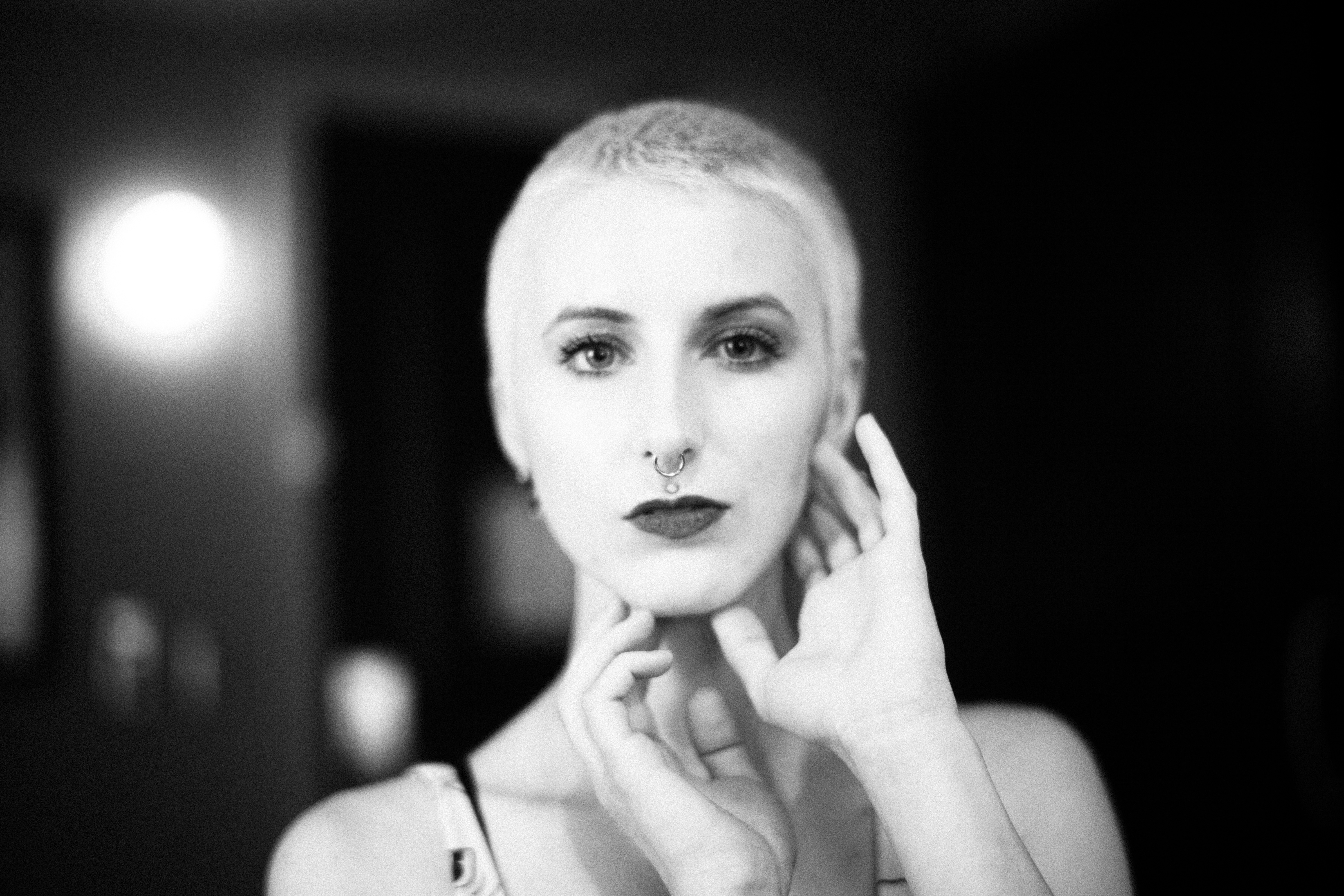 This black and white photograph captures a portrait of a person with a strikingly short haircut and bold makeup. The soft lighting gently highlights their features, creating a dramatic yet contemplative atmosphere, while a blurred background enhances the focus on their expressive posture and piercing gaze.
