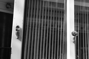 This black-and-white photograph captures a serene doorway adorned with flower pots, reflecting a blend of warmth and nostalgia. The vertical blinds filter light softly, creating a juxtaposition of shadows and subtle textures that evoke a sense of quiet contemplation. The composition is balanced, showcasing the charm of simple decor against a backdrop of domestic familiarity.