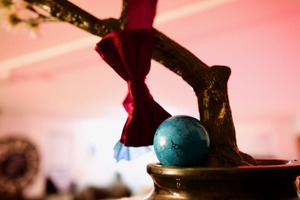 This intimate composition captures a striking turquoise orb resting beneath a textured branch adorned with a deep red bow. The dramatic lighting bathes the scene in a warm glow, enhancing the sense of serenity and whimsy. The soft focus on the background adds depth, drawing attention to the delicate interplay of color and texture.