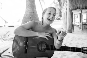 In a sun-drenched scene, a young woman laughs and engages with her surroundings while playing an acoustic guitar, embodying a carefree spirit. The black-and-white composition adds a timeless quality, emphasizing her joyous expression against the serene beach backdrop. Soft shadows cast by palm trees create an inviting atmosphere, enhancing the sense of warmth and spontaneity in the moment.
