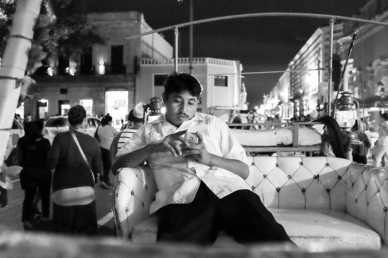 In this black-and-white photograph, a young man sits alone on a plush carriage seat, absorbed in his phone amidst a bustling night scene. The contrasting shadows and soft glow of lanterns create an intimate yet detached mood, highlighting his isolation amidst the lively backdrop. The composition draws the eye to his contemplative expression, encapsulating a fleeting moment of solitude in a vibrant world.