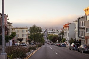 This photograph captures a quiet descent down a sloping street lined with charming buildings, leading to a cityscape shrouded in soft twilight hues. The calm atmosphere is accentuated by the lingering fog, giving the scene a dreamy, almost nostalgic quality. Gentle lighting highlights the pastel facades and lush greenery, inviting the viewer to explore the tranquil urban environment.