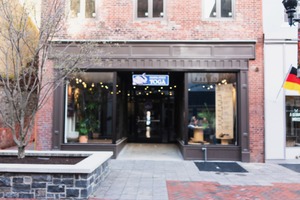The photograph captures the inviting entrance of a yoga studio, framed by a rustic brick facade that exudes warmth. Soft lighting peeks through the large glass windows, enhancing a tranquil ambiance, while the sparse decor suggests a minimalist approach to design. A delicate tree in the foreground adds an organic touch, highlighting the blend of nature and urban life.