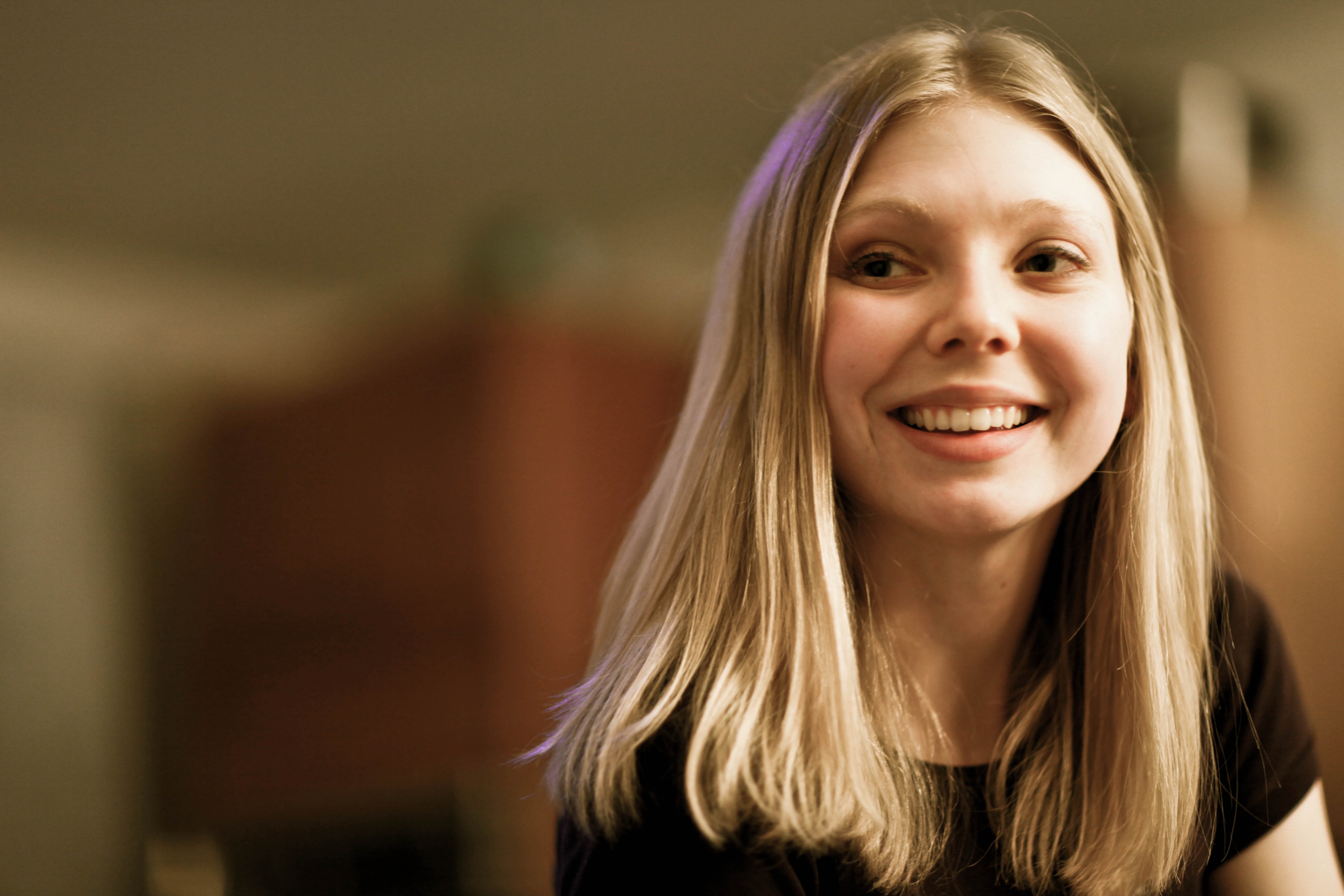 A woman with long, straight hair beams with joy, her smile radiating warmth and happiness. The soft, diffused lighting creates a gentle glow, emphasizing her expression and the inviting atmosphere. The blurred background hints at a cozy interior, enhancing the intimate mood of the scene.