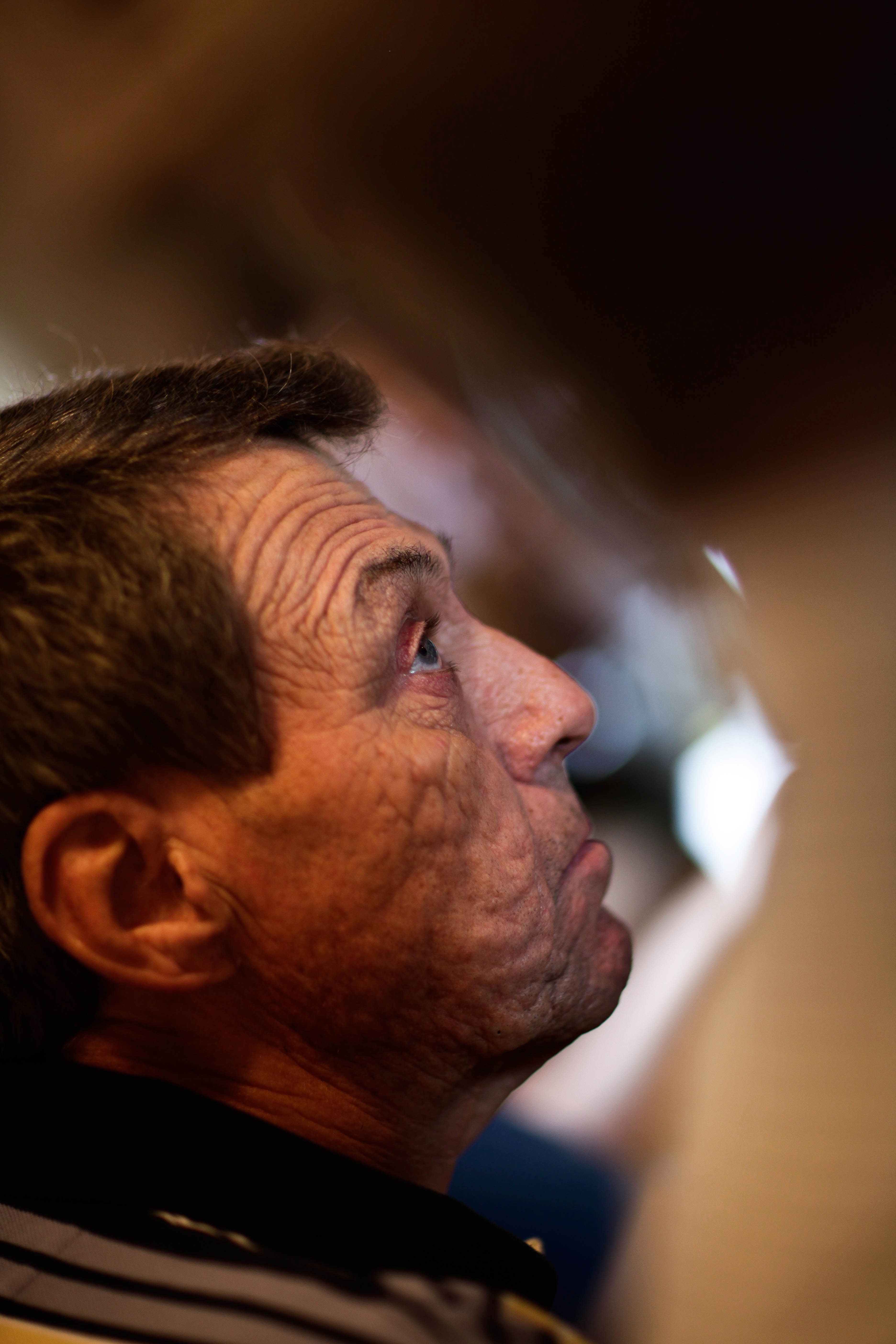 In a moment of quiet reflection, a man gazes thoughtfully upwards, his expression revealing a lifetime of experiences etched into his weathered features. The soft, diffused lighting highlights the contours of his face, enhancing the mood of introspection. The blurred background adds depth, drawing attention to the subject's pensive demeanor amidst an undefined context.