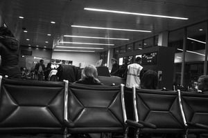 The photograph captures a bustling airport scene, set in monochrome, where the focus shifts from the silhouetted backs of waiting passengers to the distant ticketing counter. Bright overhead lights create a stark contrast against the darkened figures, conveying a sense of both activity and expectation. The composition leads the eye through the layered elements, evoking a mood of quiet anticipation in the midst of travel chaos.