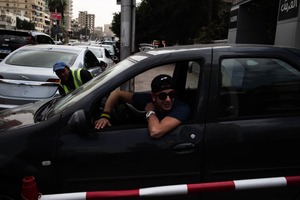 In a bustling city street, a casually dressed young man leans out of a parked car, exuding a relaxed charm. The subdued lighting creates a gritty atmosphere, while the traffic congestion hints at the lively chaos of urban life. Nearby, a reflective figure in a bright vest adds a contrasting element, further emphasizing the interplay between vulnerability and routine in this snapshot of everyday moments.