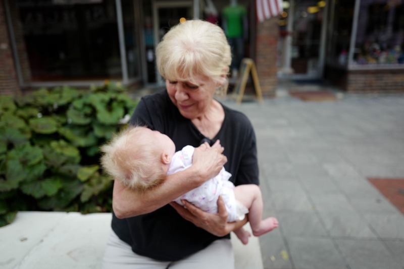 In a warm, sunlit setting, an elderly woman cradles a baby in her arms, embodying a moment of tender connection. The blurred background hints at a lively street, adding depth to the intimate scene while the soft lighting accentuates their expressions. The gentle focus draws the viewer into this poignant exchange of love and warmth.