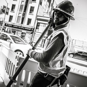 A construction worker stands poised with a metal pole, exuding a sense of strength and determination against the bustling city backdrop. The black and white scheme highlights the contrasts in light and shadow, enhancing the gritty realism of urban life. This dynamic composition captures both the individual’s focus and the motion of passing vehicles, creating a vivid snapshot of industrious energy.