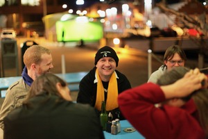 In the soft glow of nighttime lights, a group of friends shares joyous laughter around a vibrant blue table. The central figure beams with a warm smile, his bright scarf contrasting against the darker surroundings, encapsulating a mood of camaraderie and enjoyment. Blurred faces amongst the group enhance the sense of intimacy, as the lively ambiance captures a moment of connection under the night sky.