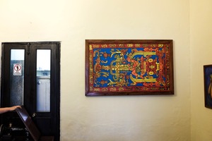 The photograph captures an intricately designed piece of artwork hung against a warm beige wall, its vivid colors offering a striking contrast. The composition features a dark doorway to the left, hinting at the interplay of shadows and light within the space, while the colorful painting draws the viewer's focus, creating a vibrant focal point. The mood is inviting and contemplative, inviting viewers to appreciate both the art and the overall atmosphere of the setting.
