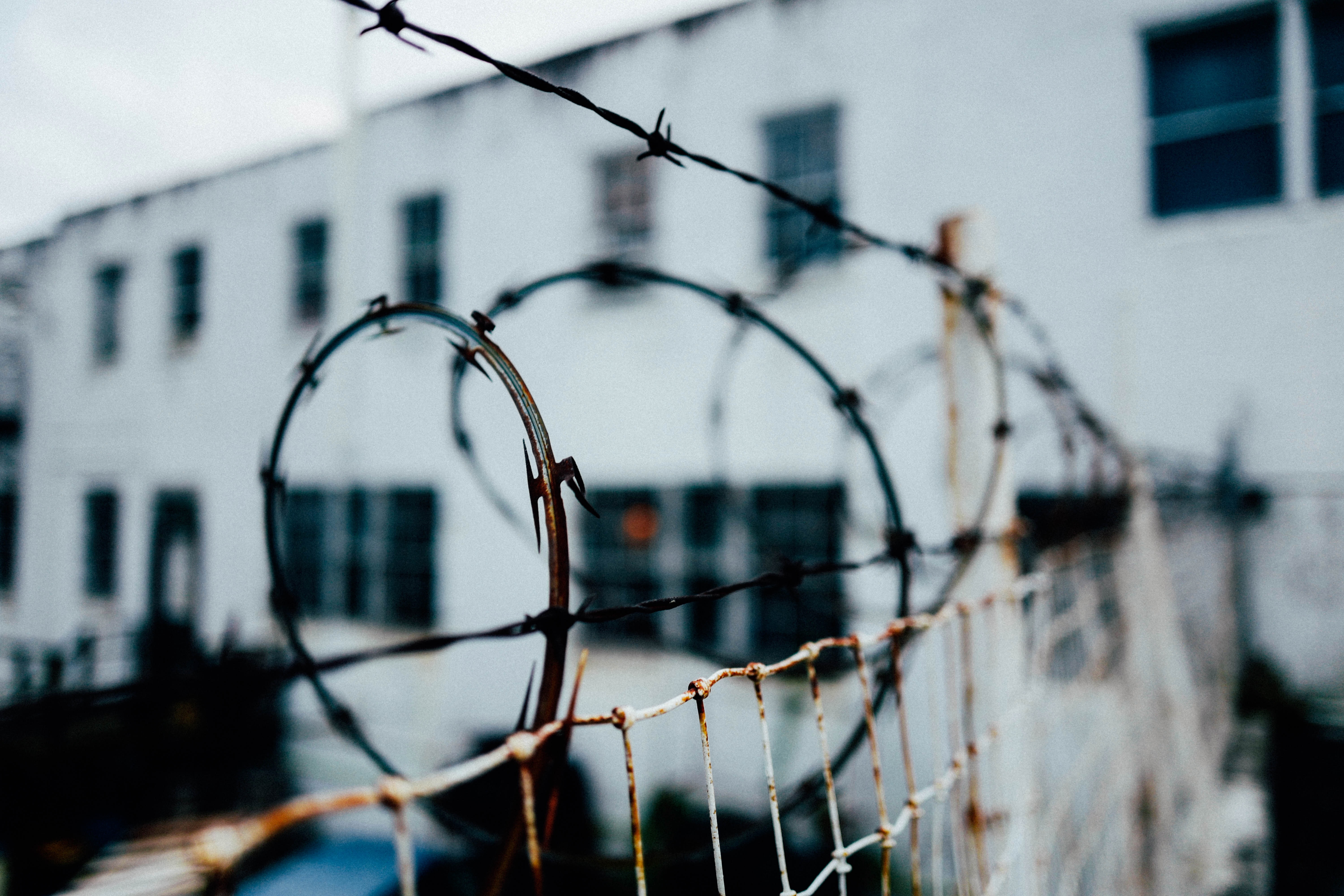 This photograph captures a close-up view of rusted barbed wire fencing, twisting in an intricate pattern against a backdrop of a stark, weathered white building. The muted lighting enhances a somber mood, evoking feelings of confinement and desolation. The shallow depth of field draws attention to the foreground, creating a juxtaposition between the harshness of the wire and the faded structure, inviting contemplation on themes of isolation.