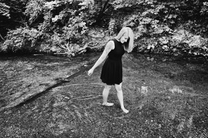 A young woman wades barefoot through a serene, shallow stream, her black dress contrasting with the natural tones of the surrounding forest. The composition draws the eye to her gentle movements, encapsulating a sense of calm introspection and connection with nature. Soft, diffused lighting enhances the tranquil mood, invoking a feeling of solitude and peace.