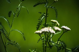 Beneath a soft, luminous green backdrop, delicate white flowers flourish, drawing the eye with their intricate beauty. A solitary bee hovers above the blossoms, adding a touch of life and movement to the serene scene. The composition captures a moment of quiet harmony in nature, illuminated by gentle, warm light that enhances the verdant surroundings.