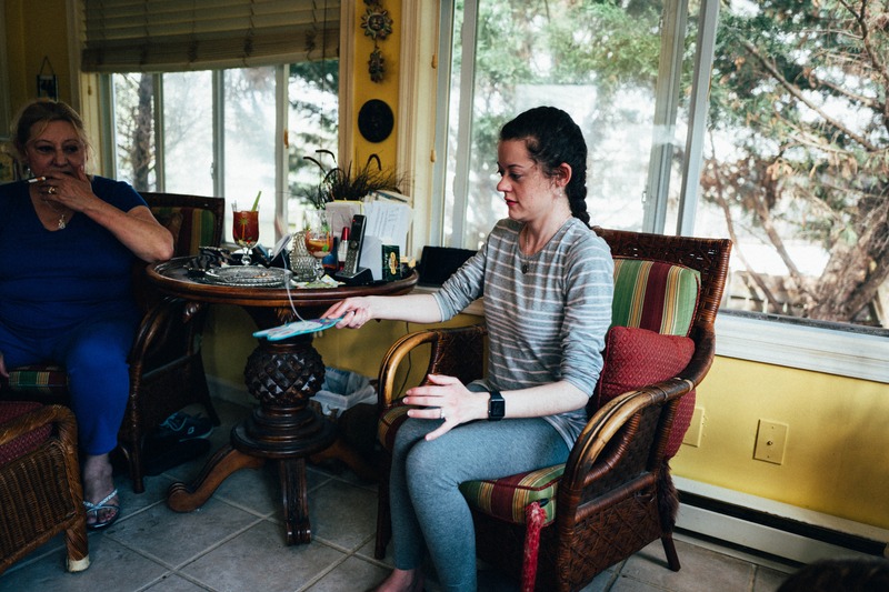 In a softly lit room filled with rustic charm, one woman sits pensively in a chair, her gaze focused on a plate in her hands, while another expresses concern or surprise nearby. The warm hues of the walls and the natural light filtering through the windows create a cozy, yet contemplative atmosphere, hinting at a moment of significance or decision. The contrasting moods of the two subjects add depth to the scene, inviting viewers to ponder their relationship and shared experience.