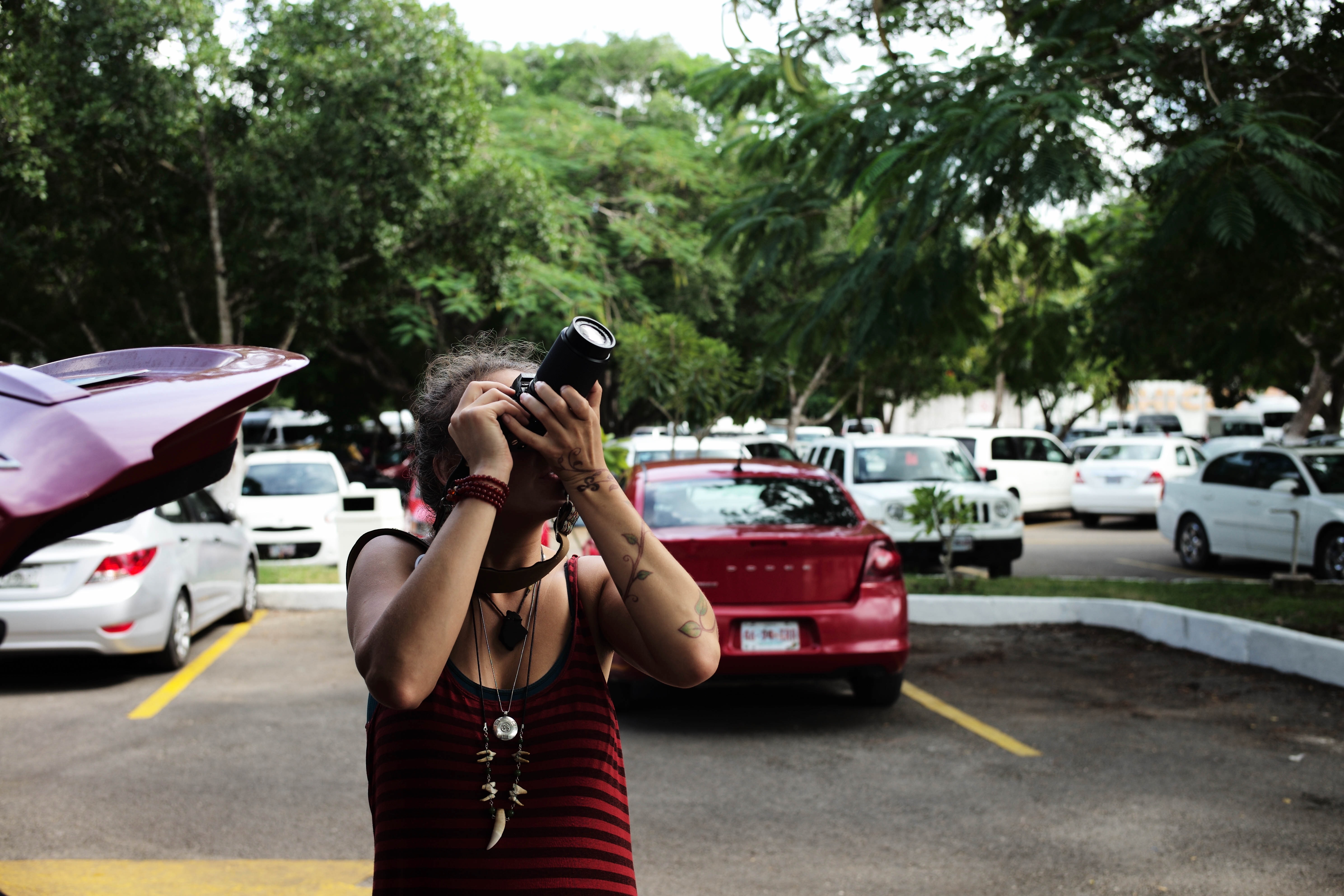 In a bustling parking lot, a young woman lifts her camera, poised to capture a fleeting moment. The warm light filters through lush foliage, casting a soft glow on her striped attire and arm tattoos, evoking a sense of creativity and spontaneity. The backdrop of parked cars adds depth, contrasting her focus on the act of photography amid the everyday chaos.