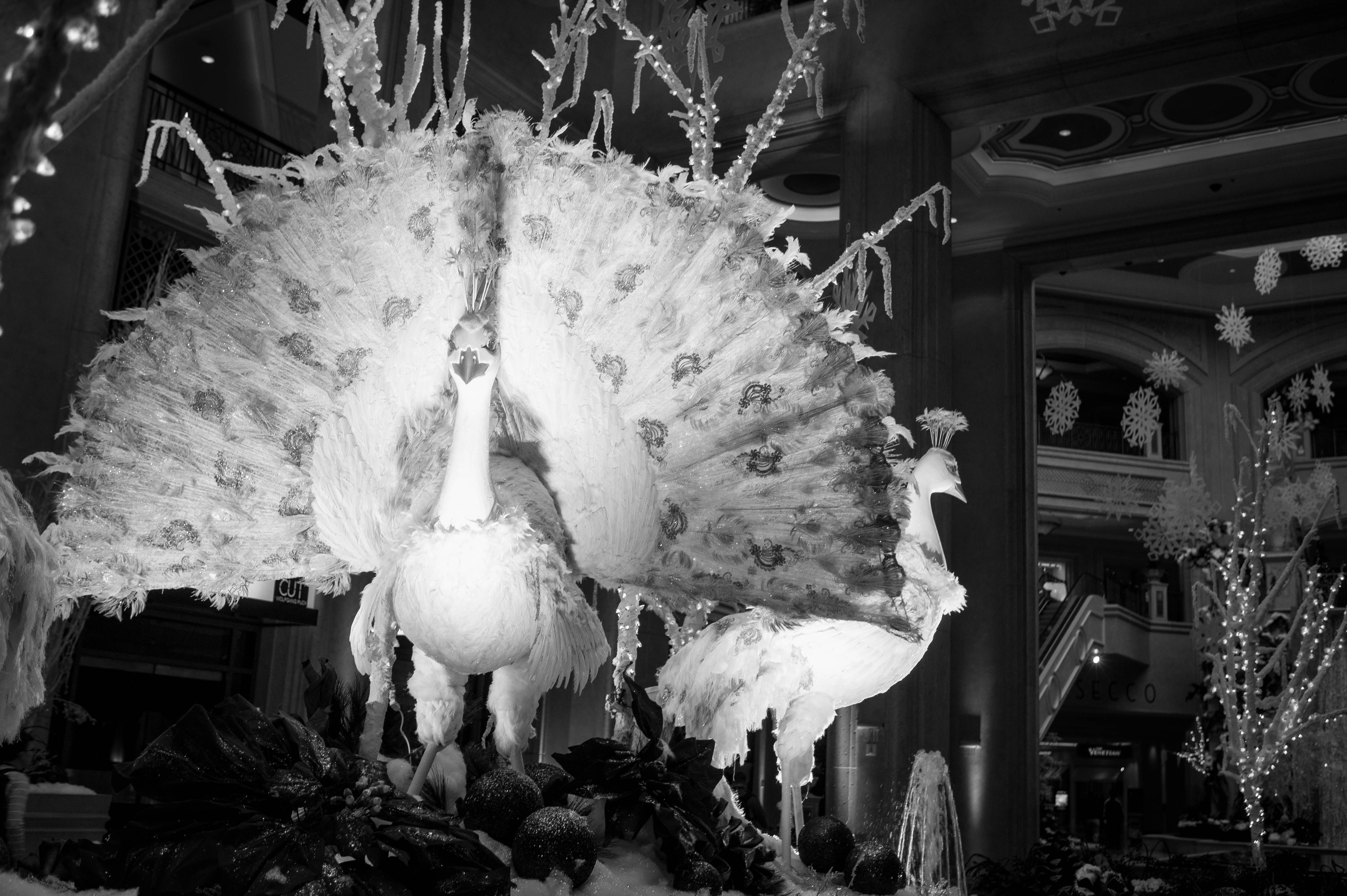 This striking photograph captures two intricately designed peacocks in a festive setting, their feathered tails fanned out majestically. The monochromatic treatment adds a timeless elegance, enhancing the ethereal quality of the scene, while soft lighting highlights the delicate details of their plumage. Surrounded by winter decorations, the composition evokes a sense of enchantment and holiday cheer.