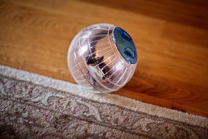 This charming photograph captures a small pet hamster inside a transparent exercise ball, rolling across a textured rug. The warm wood tones of the floor combined with soft, natural lighting create a cozy, inviting atmosphere. The composition highlights the adventurous spirit of the tiny creature, evoking a sense of playfulness and curiosity.