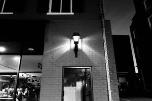 This photograph captures a dimly lit storefront, where a solitary lantern casts a soft glow on the brick wall, creating a warm, inviting atmosphere amidst the nighttime hush. The contrast of the bright 'OPEN' sign against the monochrome backdrop emphasizes the theme of accessibility and welcome. Shadows dance around the light, adding depth and intrigue to this tranquil evening scene.