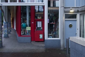 This photograph captures the inviting entrance of a quaint bookstore, framed by large glass windows showcasing colorful displays. The soft, muted lighting enhances the warm, welcoming mood, drawing the viewer’s eye toward the vibrant red door, contrasting with the cool tones of the surrounding architecture. The composition blends urban elements with the charm of literature, creating a serene yet intriguing atmosphere.