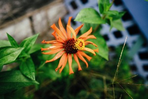 A striking orange flower stands in bold contrast against lush green leaves, the petals curling gracefully outward. Soft, natural light bathes the scene, highlighting the intricate details of the flower's center. The composition, with a gentle blur in the background, draws the eye directly to the vibrant bloom, evoking a sense of vitality and tranquility.