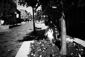 The photograph captures a solitary figure seated against a backdrop of a quiet, sunlit street, framed by soft foliage and shadows. The monochromatic tones lend a contemplative mood, highlighting the contrast between light and dark. Textures of the brick path and the surrounding plants create a sense of intimacy, drawing the viewer into a moment of quiet reflection amidst the urban landscape.