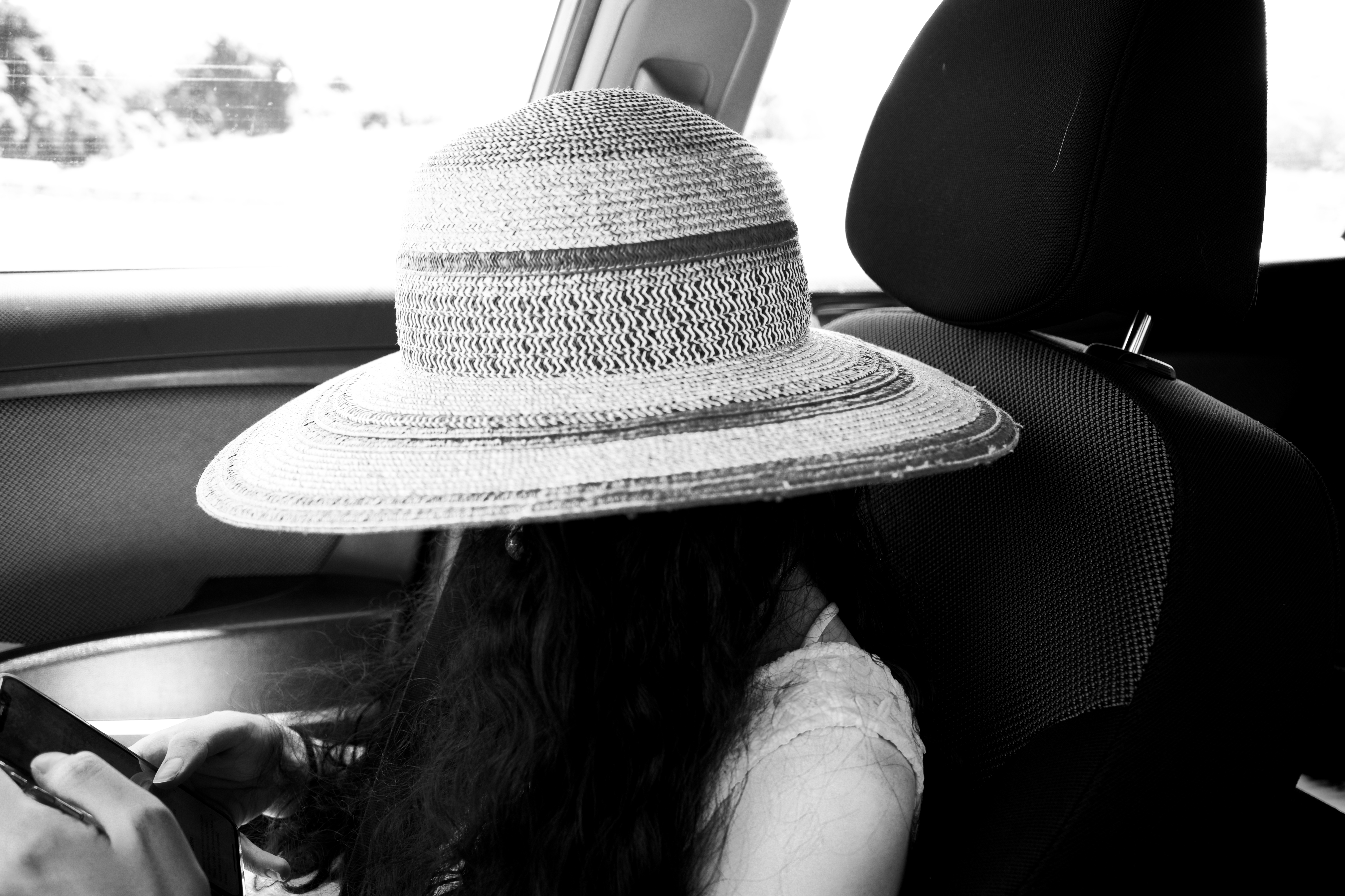 In this black-and-white photograph, a young figure is partially obscured by a wide-brimmed straw hat, creating an aura of mystery. The softness of the light illuminates the textures of the hat and highlights her relaxed posture as she engages with a device, suggesting a moment of quiet contemplation. The interior car setting contrasts with the vastness outside, capturing a serene yet introspective mood.