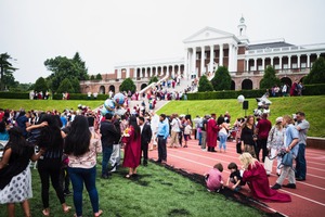 A vibrant scene captures a graduation ceremony on an athletic field, bustling with friends and family. Wearing bright gowns, graduates mingle under a gray sky, reflecting a mix of excitement and nostalgia. The composition features a panoramic view of the impressive building above, contrasting with the intimacy of small groups celebrating their achievements below.
