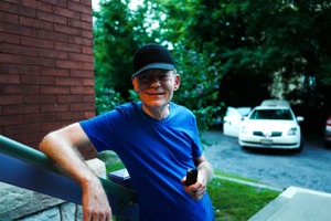 The photograph captures an older man leaning casually against a railing, his blue shirt contrasting warmly with the greens of the foliage behind him. With a relaxed smile, he embodies a friendly, inviting atmosphere, enhanced by the soft, twilight lighting that casts gentle shadows. The composition draws the viewer's gaze toward his cheerful demeanor, set against a tranquil suburban backdrop.