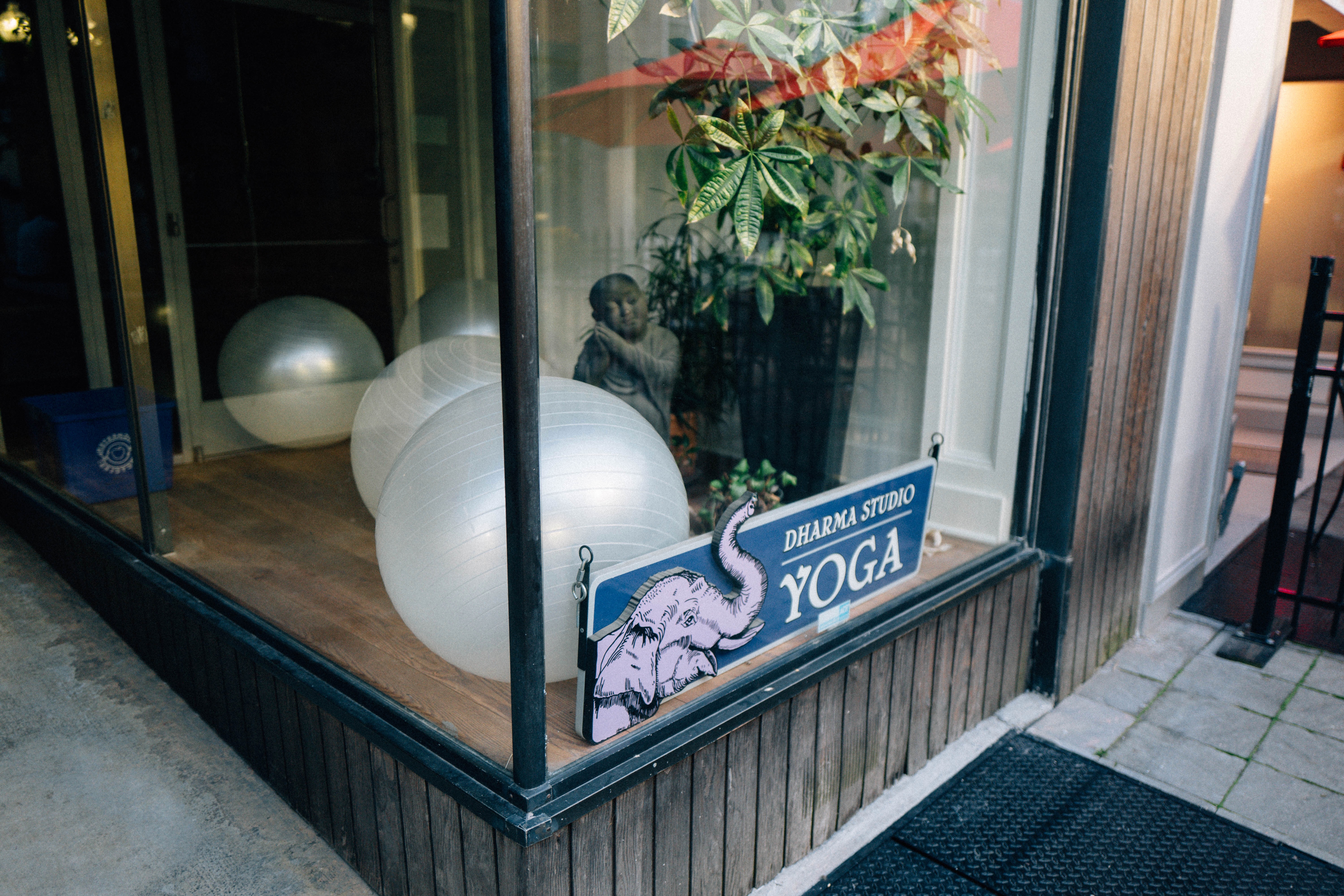 This photograph captures the tranquil ambiance of a yoga studio, visible through a glass window, where soft lighting highlights the simplicity of the setting. Three large exercise balls rest on a wooden floor beside a serene statue, framed by lush greenery, inviting a sense of calm and mindfulness. The cheerful sign featuring an elephant adds a playful touch to the otherwise peaceful composition, enhancing the studio's inviting charm.