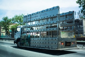 A truck adorned with a sleek metal frame transports sheets of laminated glass along a bustling highway. The bright daylight accentuates the truck's reflective surface, giving it a modern, industrial feel. Lush greenery and electrical equipment provide a contrasting backdrop, setting a dynamic urban scene.