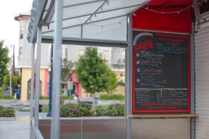 In this photograph, a quaint ice cream stand features a vibrant chalkboard menu, showcasing today's flavors in a cozy, inviting setting. The soft, warm lighting creates a relaxed atmosphere, hinting at delightful summer evenings. The blurred background of colorful buildings and greenery enhances the nostalgic feel of a perfect day out.