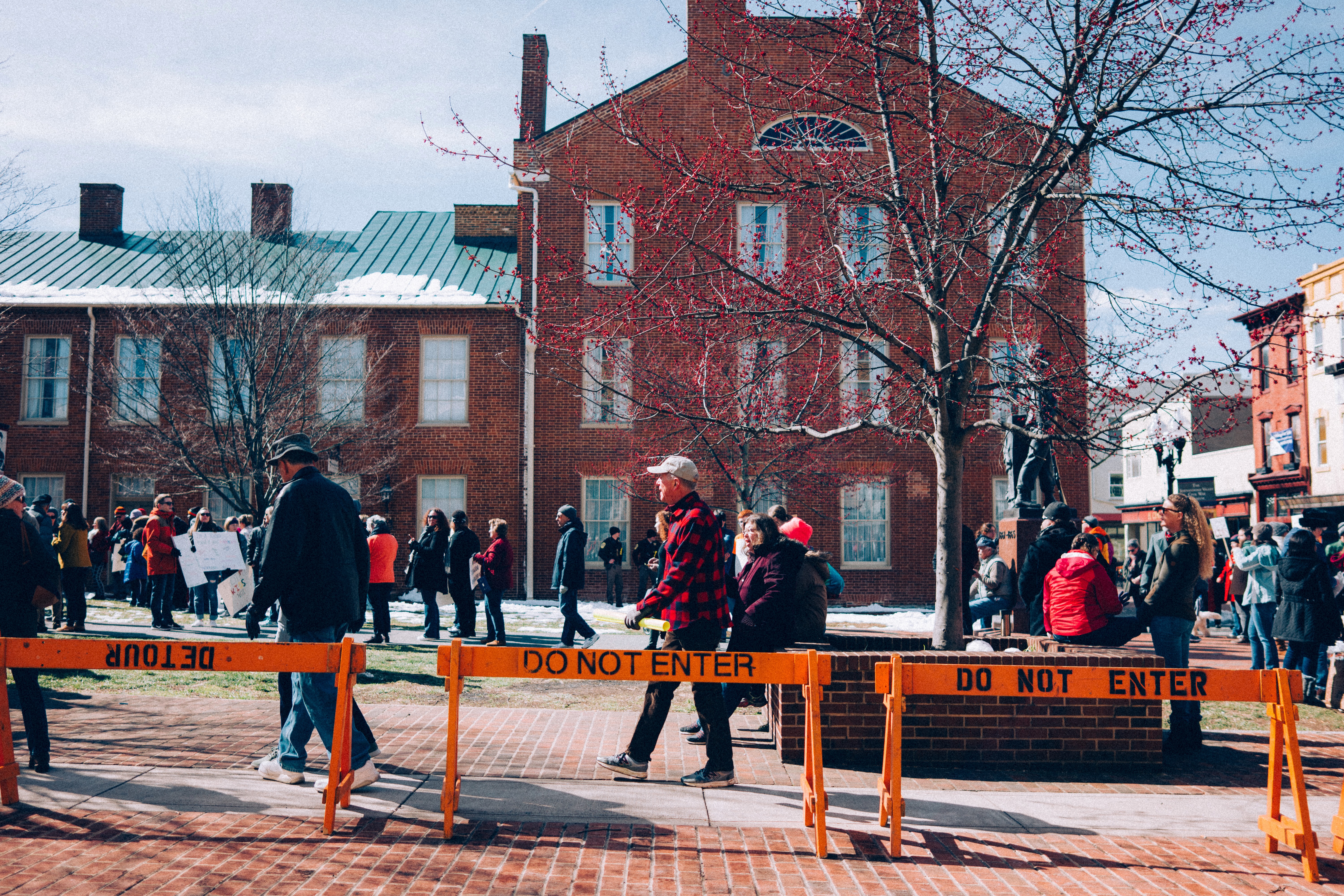 A vibrant scene of a community rally, captured under a bright winter sky. People gather purposefully around a barrier that reads 'DO NOT ENTER', suggesting both a sense of urgency and determination. The contrast of the warm red brick buildings against the chilly atmosphere conveys a mood of solidarity and hope, as individuals engage in meaningful discourse.