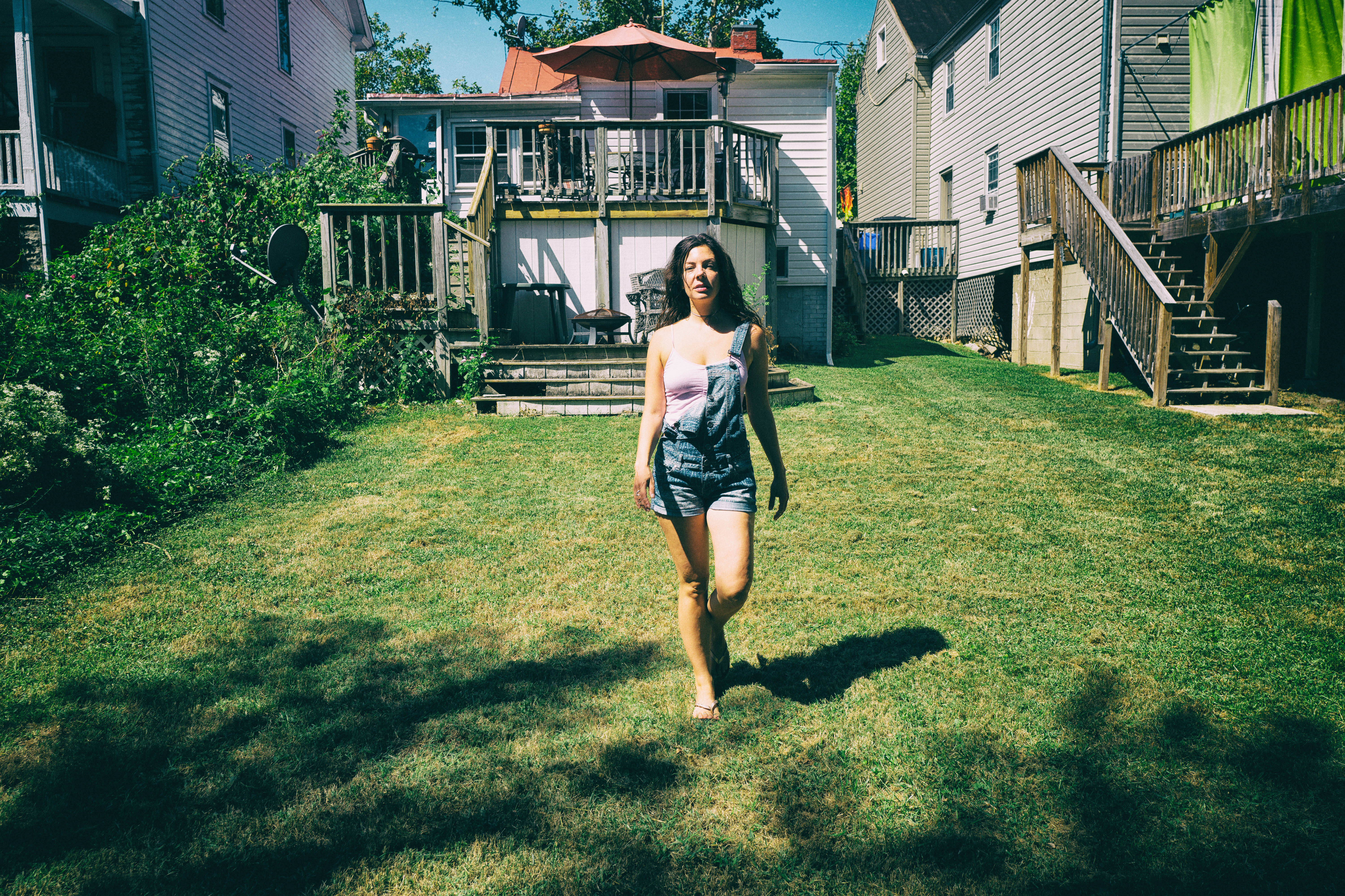 In this vibrant photograph, a young woman walks confidently across a lush green lawn, embodying the carefree spirit of summer. The warm sunlight casts playful shadows, enhancing the relaxed atmosphere, while the backyard setting with its wooden decks and lively colors adds depth to the composition. The overall mood is joyful and inviting, capturing a moment of leisure and connection with nature.