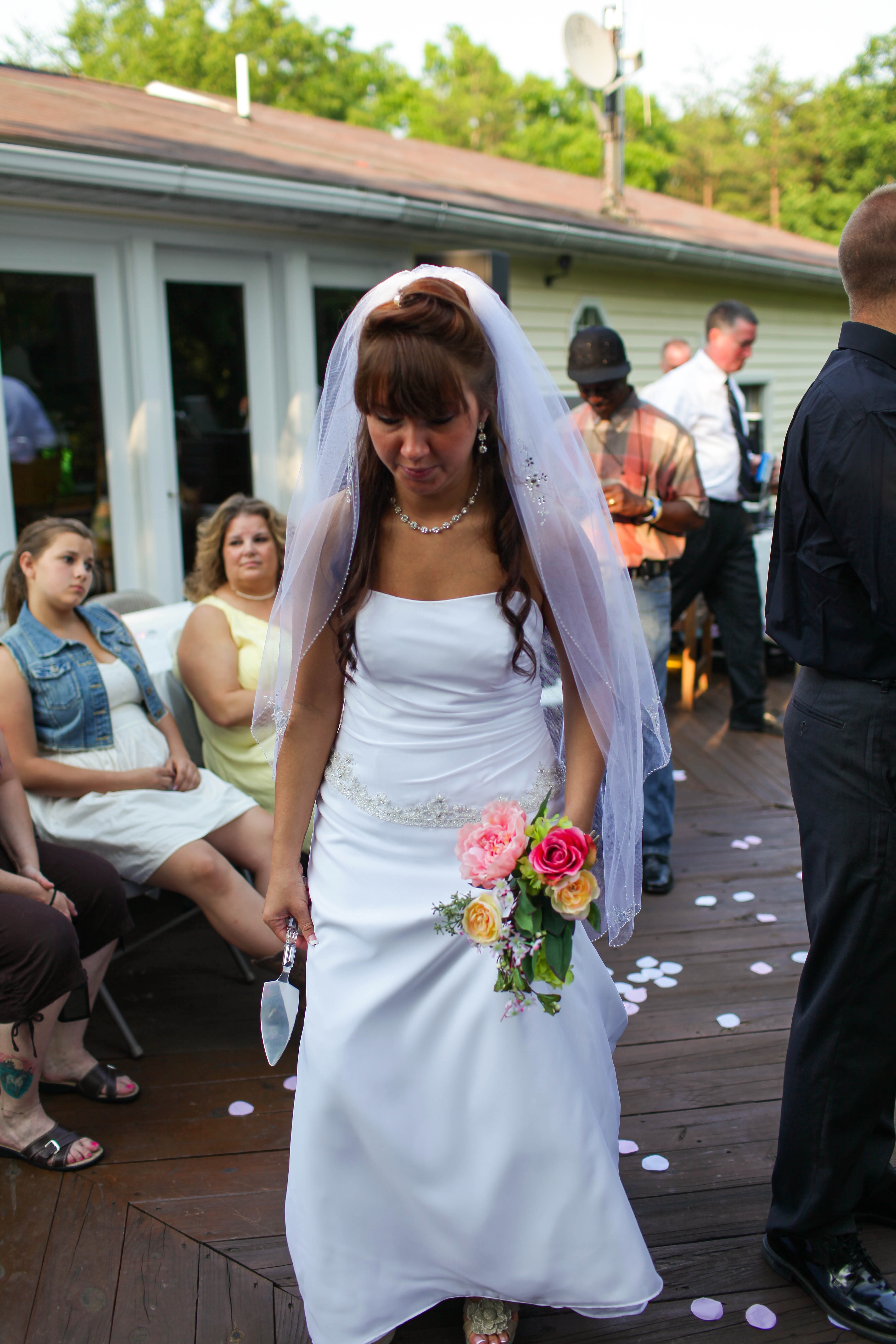 The photograph captures a bride in her elegant white gown, seemingly lost in thought as she walks on a wooden deck. Sunlight gently illuminates the scene, creating a warm, intimate atmosphere amidst a gathering of guests who observe her with varied expressions. The scattered flower petals on the ground suggest a celebration, contrasting with the bride's pensive demeanor.