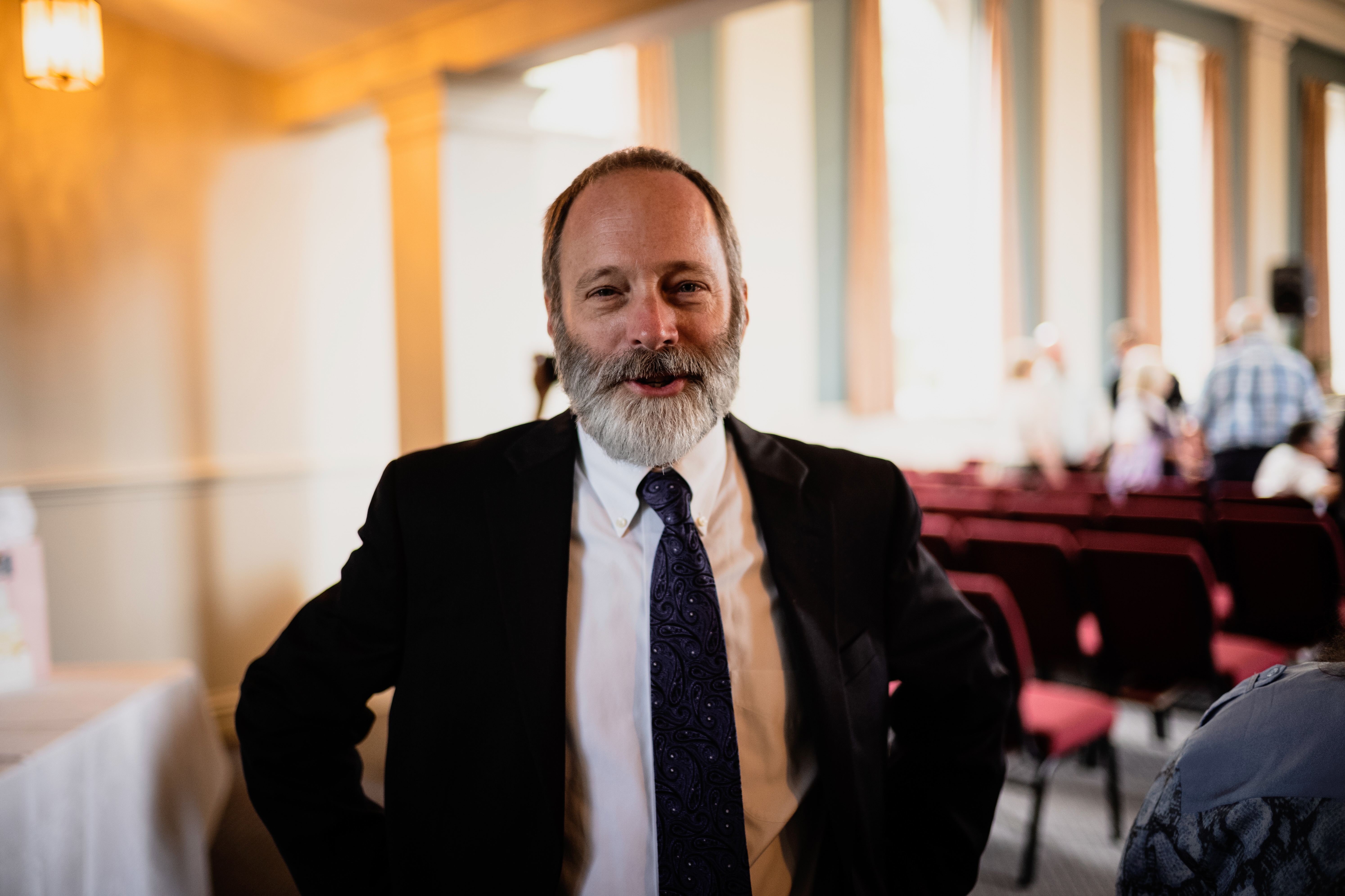 The photograph captures a well-groomed man with a distinguished beard, smiling confidently in a formal black suit against a softly lit background. Warm, golden light filters through tall windows, adding a welcoming ambiance to the scene, while the blurred figures in the background suggest a lively gathering. The composition balances the subject well, creating a sense of connection and approachability.