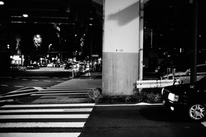 This black-and-white photograph captures a quiet urban scene at night, illuminated by scattered streetlights. A solitary car sits near the edge of a crosswalk, while a pillar looms overhead, creating a sense of confinement amidst the city's bustle. The interplay of light and shadow evokes a mood of stillness infused with anticipation, highlighting the contrasts of urban life.