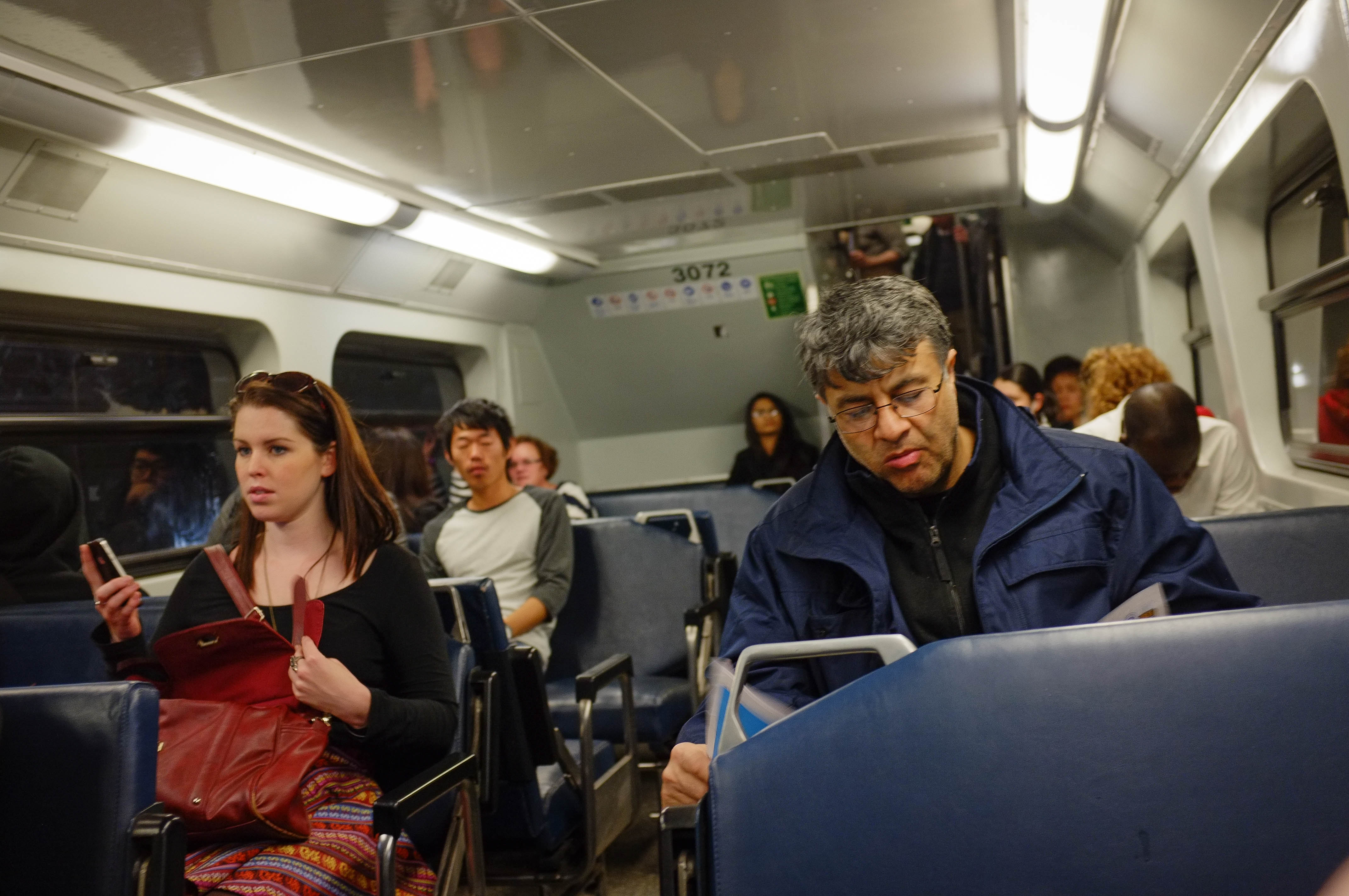 A candid snapshot captures a diverse group of passengers on a train, each immersed in their own world. The contrasting expressions—a woman with a thoughtful gaze and a man deeply focused on a reading material—highlight the solitude found in public spaces. Soft overhead lighting and the metallic interior create a subdued, contemplative atmosphere, enhancing the sense of shared yet individual journeys.