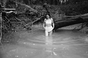 In this evocative black-and-white photograph, a woman wades through a shallow, muddy pool surrounded by lush greenery and twisted roots. The gentle ripples in the water reflect her serene expression, accentuating a sense of calm and introspection. Soft, diffused lighting creates a dreamlike atmosphere, inviting viewers to connect with her peaceful moment in nature.