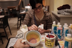 In a cozy cafe setting, a young woman focuses intently on painting a small figurine, embodying a moment of creativity and concentration. The warm, soft lighting adds a relaxed atmosphere, highlighting the vibrant colors of the paints and her expressive features. The composition draws the viewer’s eye to both the artist’s work and the communal joy of artistic expression.