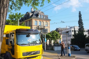 This photograph captures a vibrant urban scene where a bright yellow delivery truck dominates the foreground, contrasting with the muted architecture of nearby buildings. The composition is balanced by the lush greenery and the clear blue sky, creating a sense of liveliness and morning energy. A lone figure stands quietly, immersed in their phone, adding a human touch to the bustling city atmosphere.