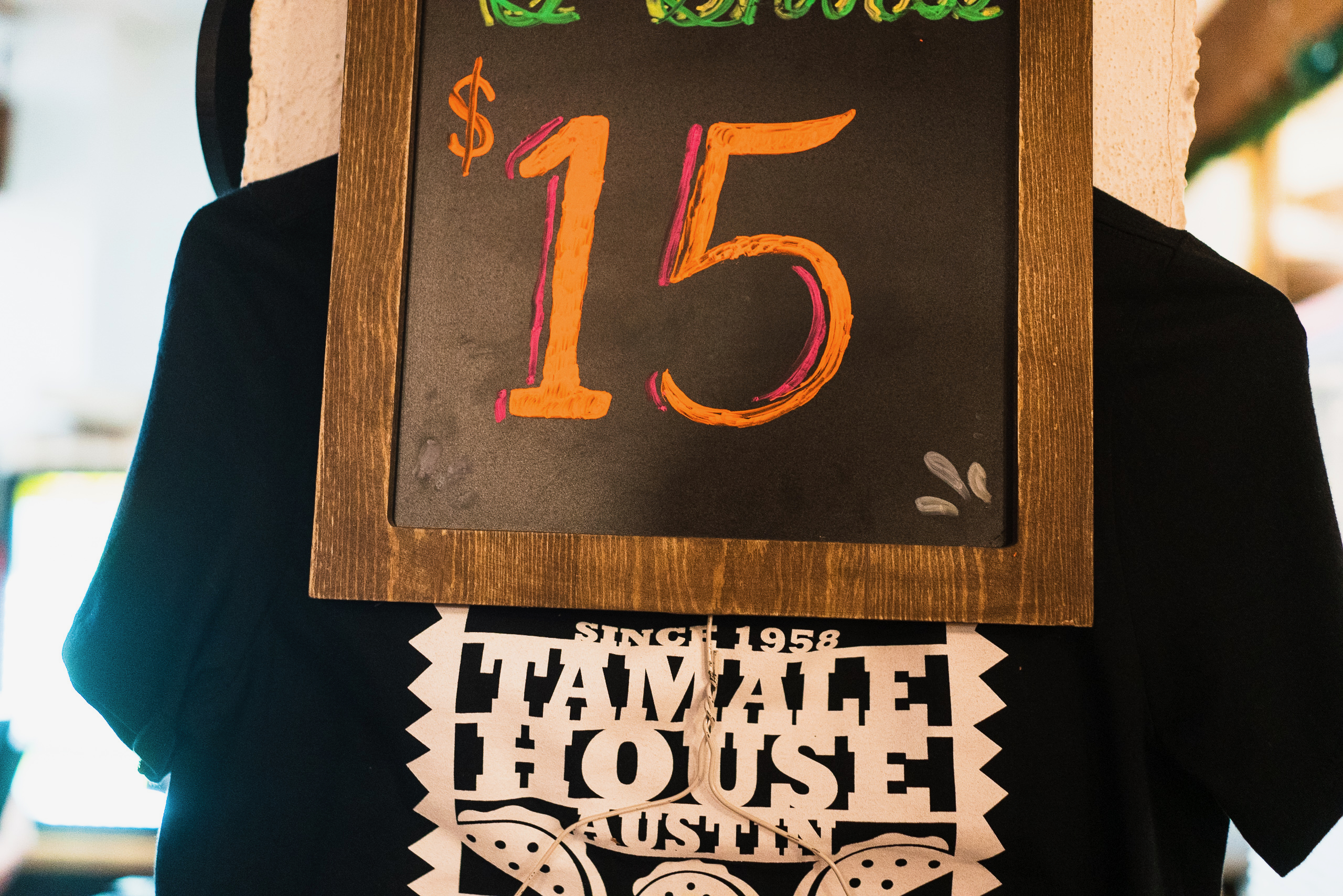 The photograph captures a vibrant black t-shirt adorned with bold, graphic text, showcasing the iconic Tamale House since 1958. Above it, a charming chalkboard sign in colorful lettering announces a price of $15, embodying a playful and inviting mood. The warm lighting enhances the rustic ambiance, drawing attention to the local cultural significance of the clothing on display.
