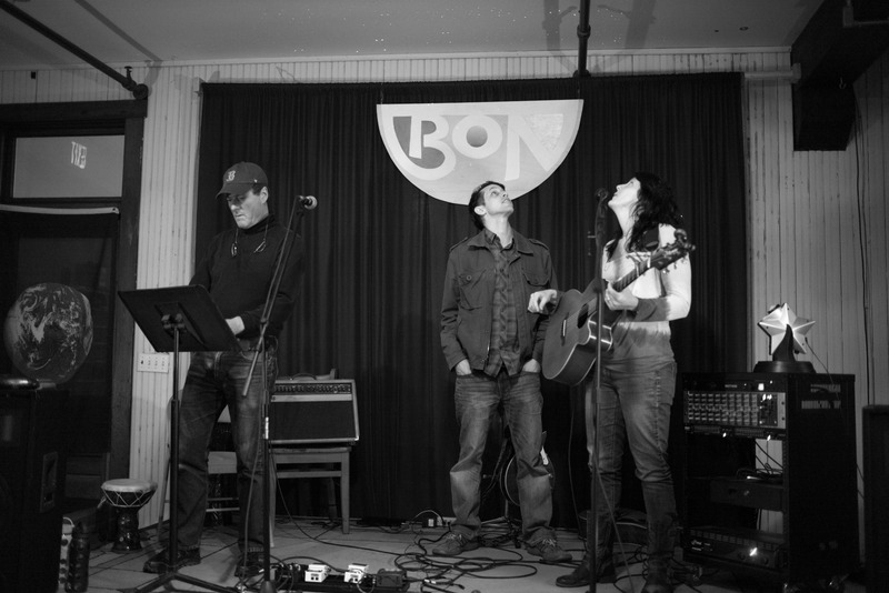In a dimly lit venue, three performers stand amidst a collection of musical equipment, each absorbed in their moment. The monochrome tones amplify the intimate atmosphere, while the bright spotlight casts a warm glow on the woman holding the guitar, creating a focal point of connection and creativity. Their expressions convey a blend of anticipation and engagement, reflecting the spirit of live music.