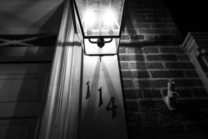 The photograph captures the warm glow of a lantern illuminating a house number, casting dramatic shadows on the textured brick wall. The contrast of light and dark, accentuated by the black and white palette, evokes a sense of mystery and solitude. The slight angle of the shot draws the viewer's eye towards the inviting yet enigmatic entrance, enhancing the overall ambiance.