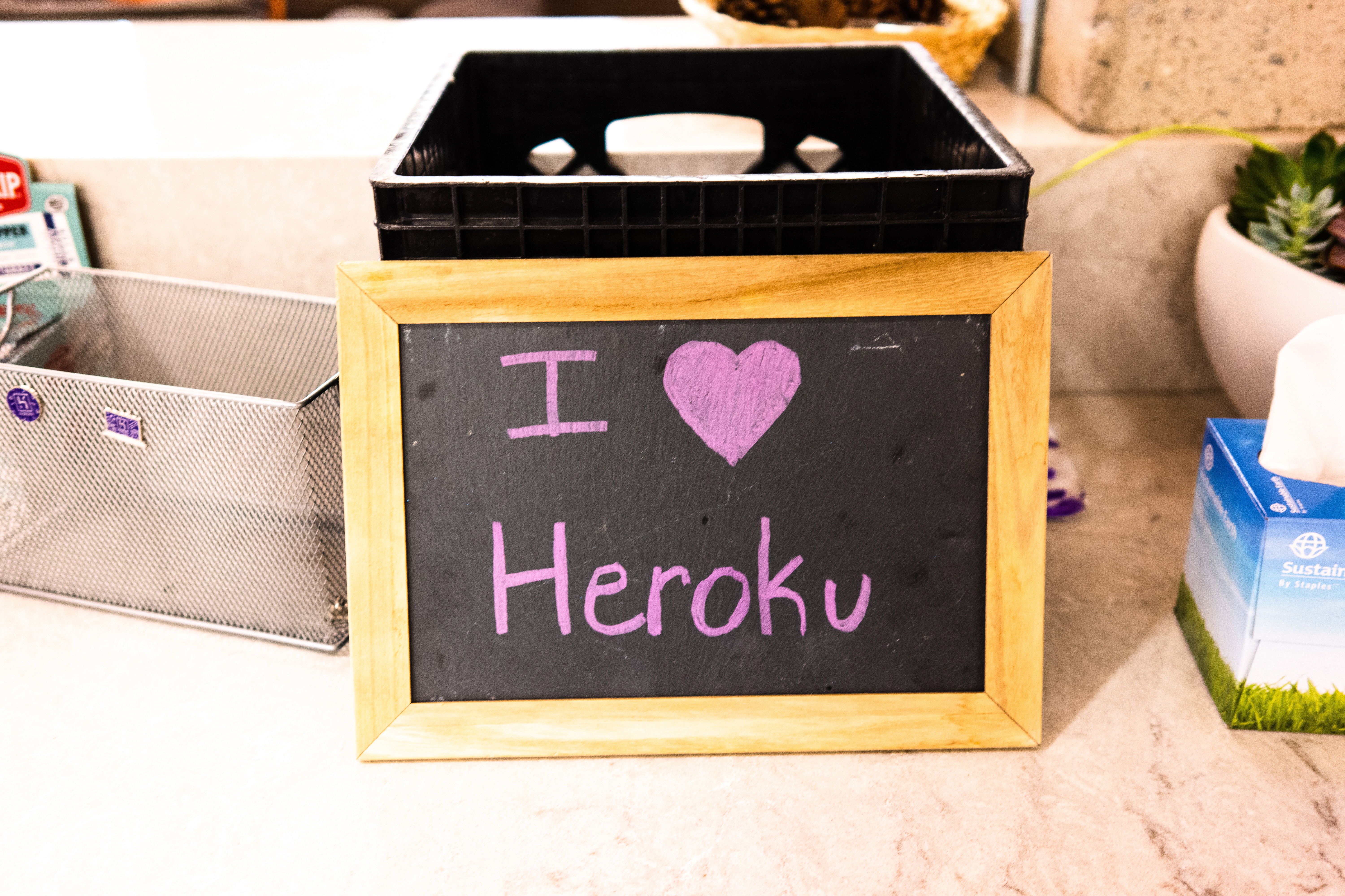 A charming chalkboard sign boldly states 'I ❤️ Heroku' in playful pink lettering, framed by a natural wood border. The cozy, casual setting is highlighted by warm lighting, creating an inviting atmosphere that radiates enthusiasm and personal touch. In the background, subtle hints of everyday items add context, enhancing the sense of a lively space filled with fondness for technology.