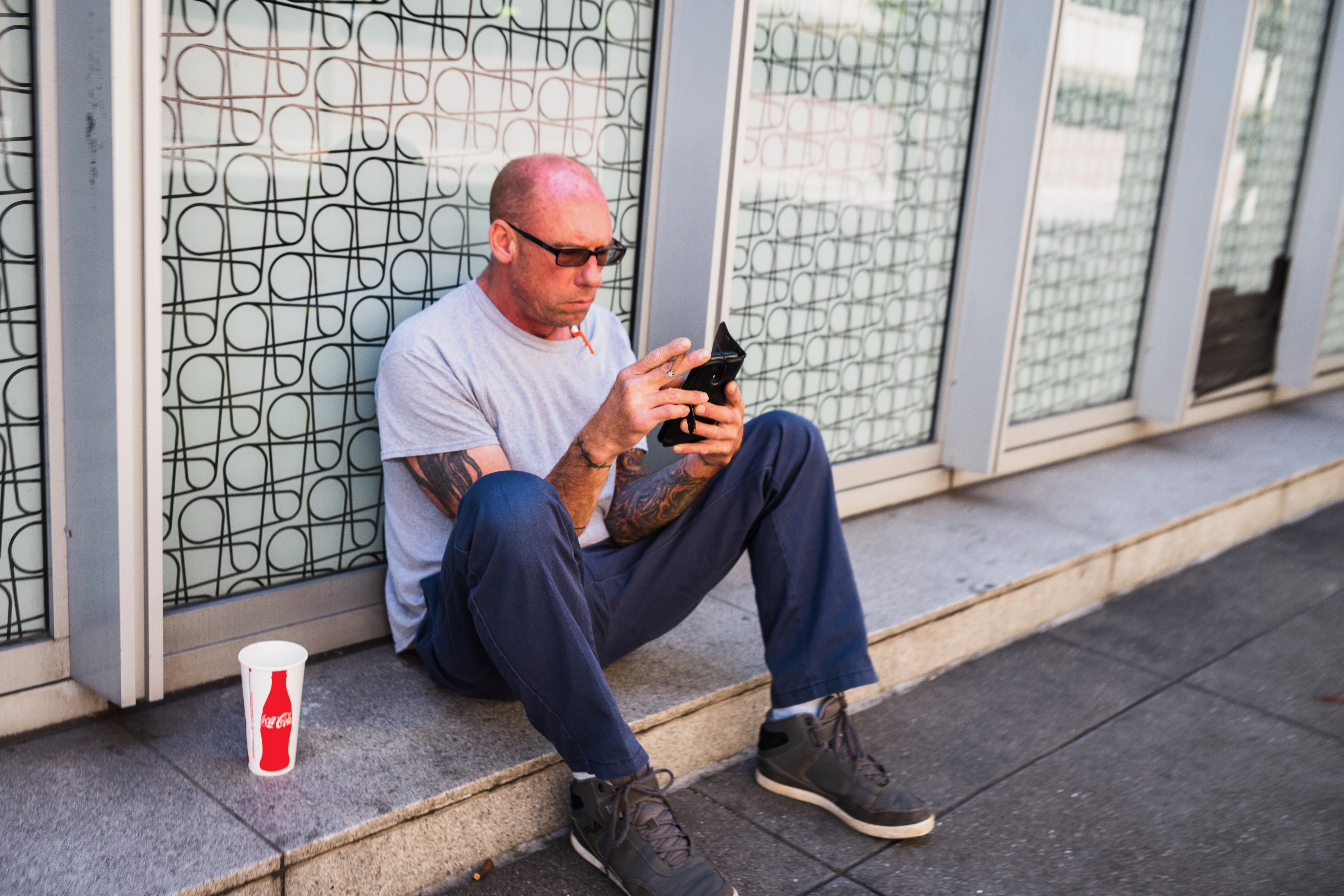 A man sits casually against a modern glass storefront, absorbed in his phone. The midday light casts bold shadows, enhancing the textures of his tattooed arms and the smooth concrete beneath him. The scene evokes a sense of solitude amid the bustling urban environment, captured in vibrant colors yet tinged with a moment of introspection.