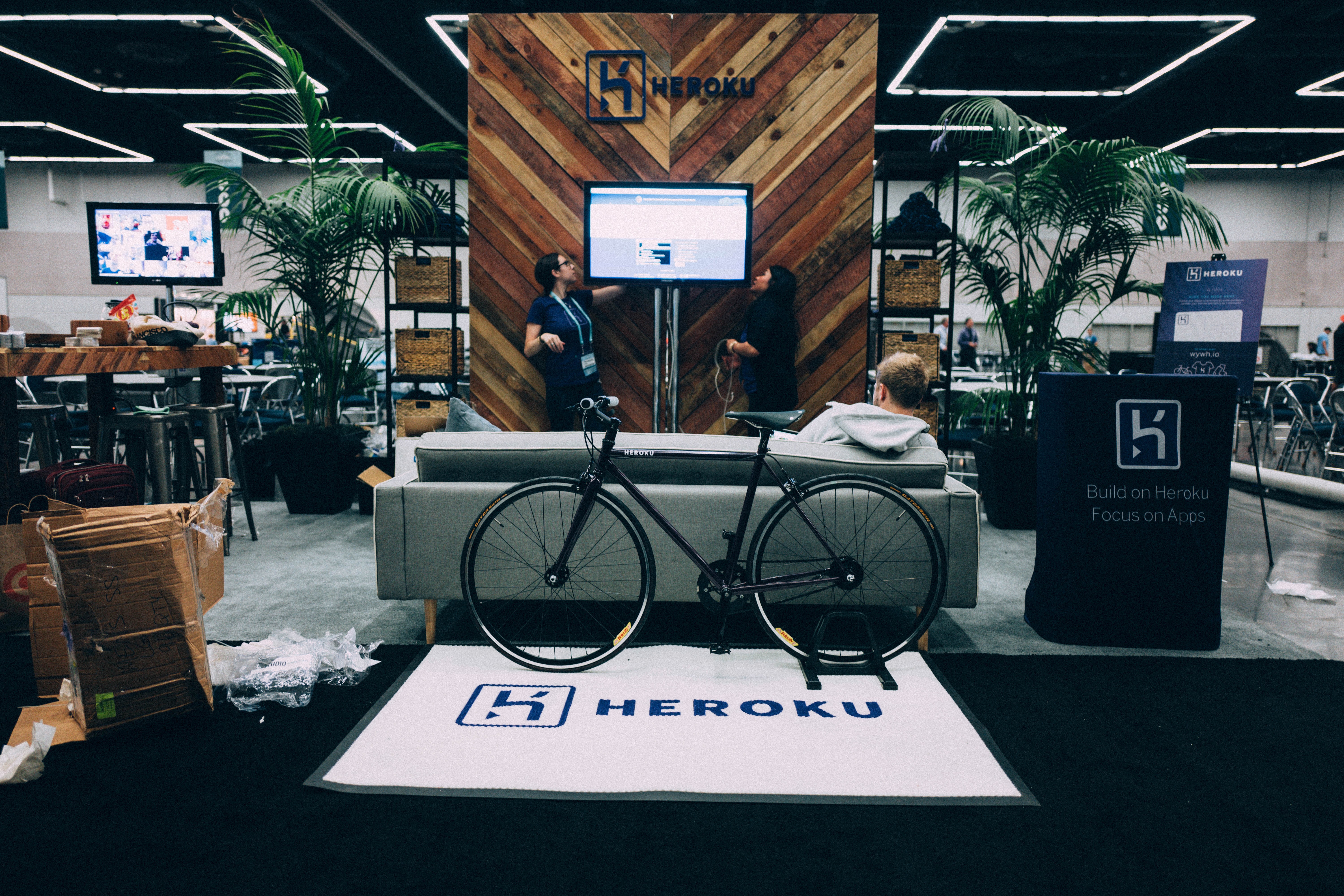 The photograph captures a vibrant tech booth featuring a cozy seating area, a sleek bicycle, and an engaging presentation backdrop. Two attendees are animatedly discussing in front of the screen, exuding a sense of collaboration and innovation, while soft, ambient lighting casts a welcoming mood across the space. Lush greenery juxtaposes the modern design, enhancing the inviting atmosphere of the event.